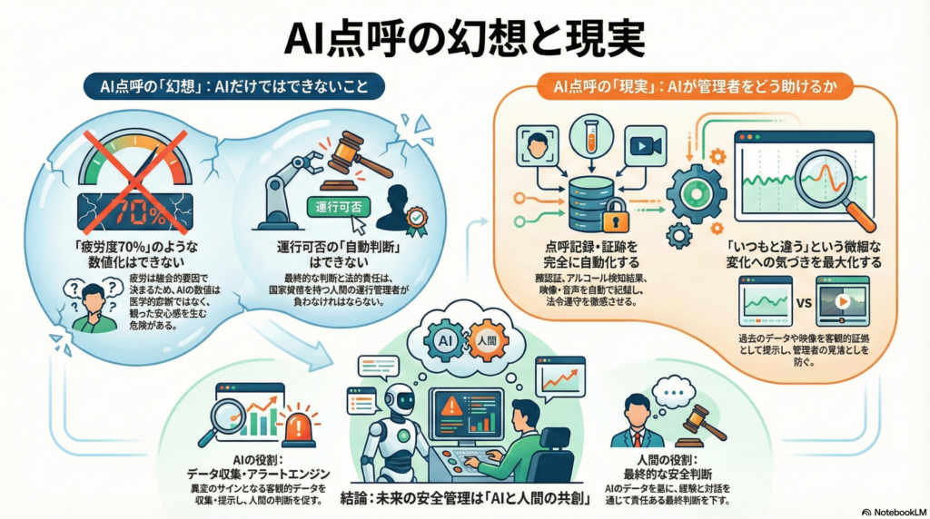 まずはっきりさせておきたいのは、「AIが勝手に判断し、勝手に安全を保証してくれる」という幻想は捨てるべきだということです。現在の技術レベルにおいて、AIやシステムが運行管理者に代わって医学的な診断や、個人の深刻な体調異変を完全に判断することはできません。