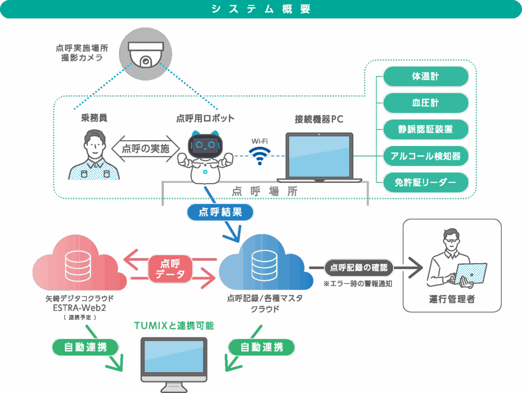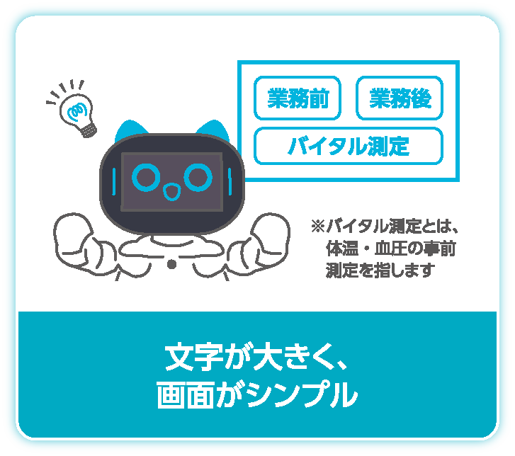 AI搭載ロボットによる新しい点呼システムです。 毎日の点呼システムをスマートに改善します。 SAN点呼が毎日の点呼業務を劇的に改善する6つの特徴 1.PC操作不要。 2.点呼はタッチパネルの操作で完結。 3.文字が大きく画面がシンプル。 4.静脈認証でスピーディーな本人確認。 5.点呼データはクラウドに自動保存。いつでもどこでも確認可能。 6.業務前点呼で必要な対応がスマートフォンからも可能。 自動点呼の主な要件 前の記事 連動機器 次の記事